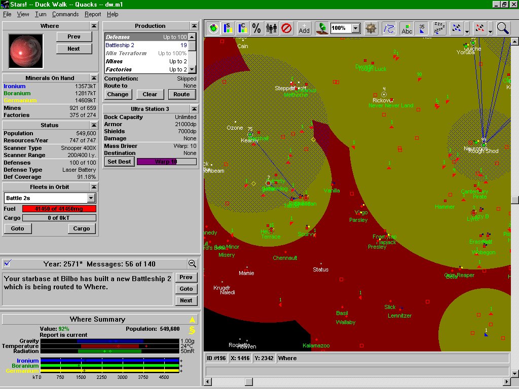 Stars! is a turn-based space conquest strategy game for Windows. Many believe it is the BEST strategy game available today. Check out the official web site (sorry, long dead link) for the game Stars! or visit other Stars! web sites with a variety of game resources including strategy guides, calculators, and mapping utilities. Multi-player games are played by exchanging turn files with a game host by using e-mail, an IRC chat server, an automated web server, a local network, or any other method of sharing files. Stars! AutoHost automates this process for you. Try Stars! with a playable demo version download from here. Stars! is no longer available for sale from any retail store that I know of. The full version currently requires a serial number to play. See this forum entry on how to get a serial number. Check out this screen-shot of a game in play. The game interface is detailed but allows you simple control with some automation or even detailed control of game play. |